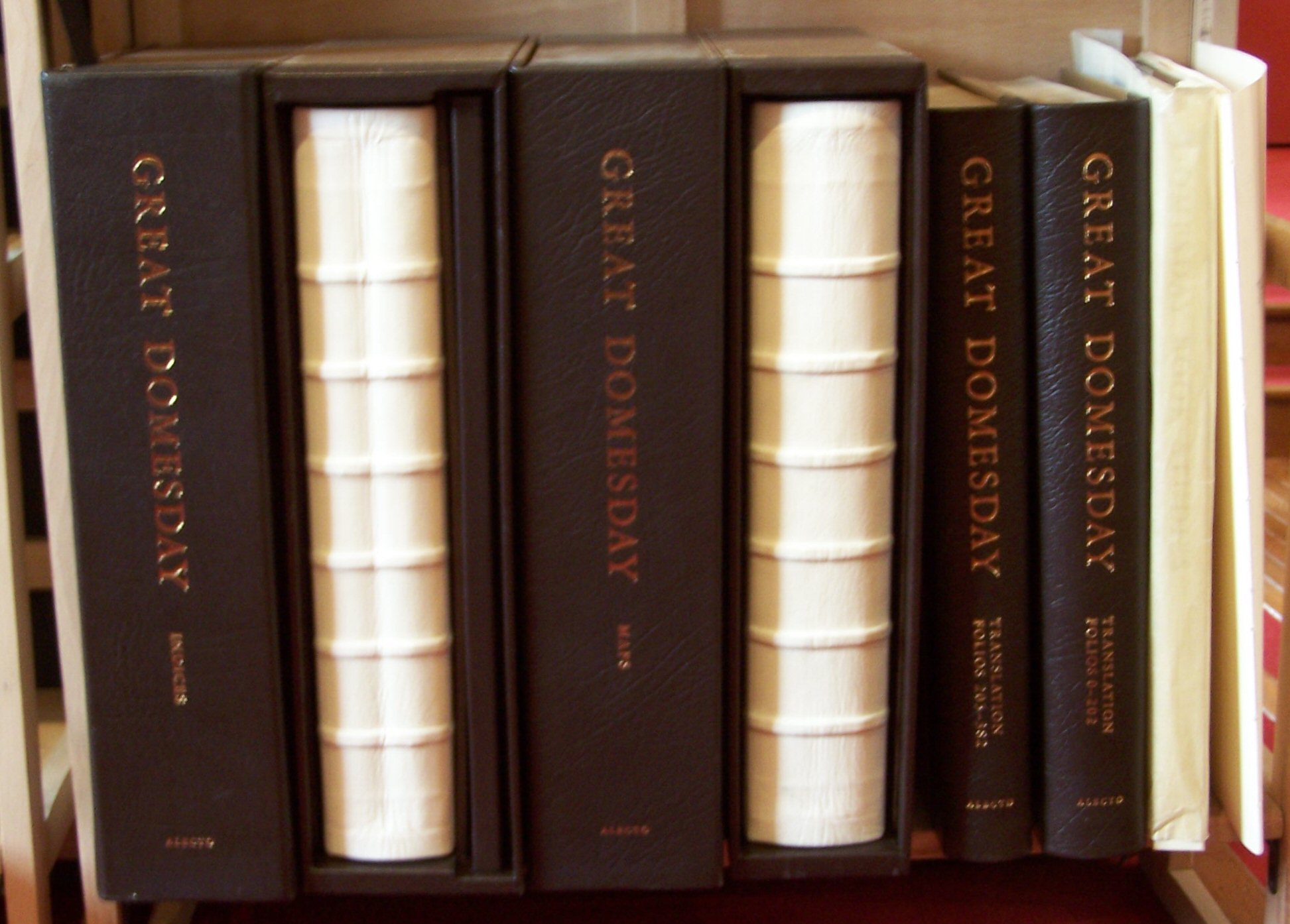 Great Domesday Book, 'Penny' Edition. [Alecto Historical Editions, 1986], one of 250 numbered sets, 2 vol., folio, full colour continuous tone offset lithographic facsimile, original calf backed polished antique oak boards, edges untrimmed, 2 coins inset in vol.1 (silver penny of William I, King of England, and proof specimen of 1986 bronze penny of Elizabeth II, Queen of England), together with: Great Domesday: Introduction and contents of the manuscript. 1986, folio, number 155 of 250 numbered sets, signed by baron hailsham and g.h. martin (keeper of public records), original calf backed buckram, original calf and buckram slipcases; Domesday Book: Studies. 1987, folio, illustrations, original buckram backed boards; [Maps] [1987], 28 numbered folding colour maps, key, together with: Notes to the translations of Great Domesday. 1988, folio; Fascicules (separate county translations). [1988-92], vol.3-7, 9, 11, 14, 16-20, 22, 23, 28, folio, 16 vol. (only, of 32) [these were superseded by the 2 bound translation volumes, present here], original wrappers, original calf and buckram case; Indices. 1988-92, folio, 33 parts in 32, original wrappers, original calf and buckram case; Great Domesday: Translation...including all folios subsequently added to the manuscript. 1992, 2 vol., folio, original calf-backed buckram, t.e.g.; The Domesday Book: a Prospectus. 1986, folio, loose inserts, original wrappers (8)