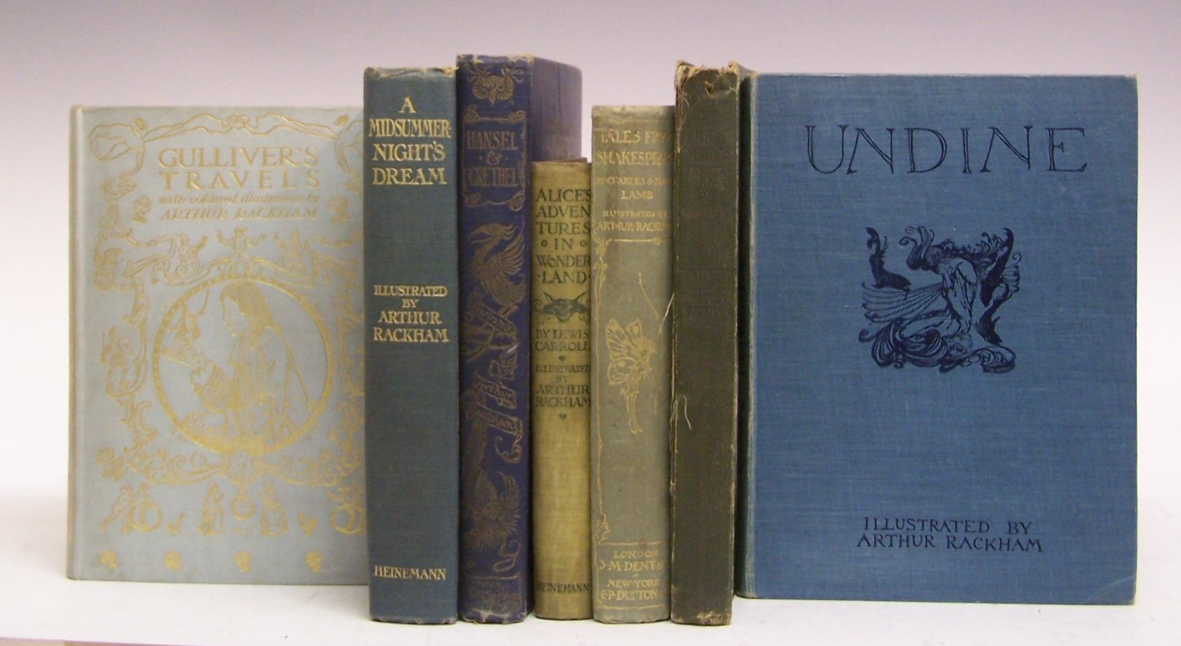 Gulliver's Travels. London: J.M. Dent, 1909, 8vo, 12 plates, original decorative cloth gilt, some discolouration to backstrip, endpapers browned; Ibid A midsummer night's dream. London, 1920, 8vo, 40 tipped in plates, original blue cloth gilt, some slight rubbing to extremities, occassional foxing; Ibid Hansel & Grethel. London, 1920, 8vo, 18 [of 20] tipped in plates, original blue cloth gilt, upper board water stained to edge, endpaper browned, front endpaper torn; Ibid Alice's adventures in Wonderland. London, [1907], 8vo, 13 plates, original green cloth gilt, sunned, occassional spotting; Ibid Undine. London, 1925, 8vo, 11 tipped in coloue plates, original blue cloth, sunned, corners bumped, interior very clean; Lamb, Charles & Mary Tales from Shakespeare. London, 1909, 8vo, 12 plates by Rackham, original cloth gilt, some rubbing, decorative endpapers with later colouring, foxing; Milton, John Comus. London, [No date], 8vo, 24 tipped in plates by Rackham, original green cloth gilt, rubbed, torn at head of backstrip (7)