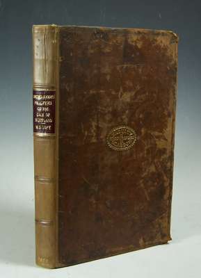Footnote: Sir Robert Spottiswoode (1596-1646) became Lord President of the Court of Session in 1633. The work contains in contemporary handwriting a speech delivered by Sir Robert as President of the College of Justice to the Advocates of the Session in the year 1633 expressed in some instances in the Scottish vernacular and differing from the published edition of that speech.Provenance: John Girvan; Faculty of Procurators in Glasgow, gilt stamp on covers.
