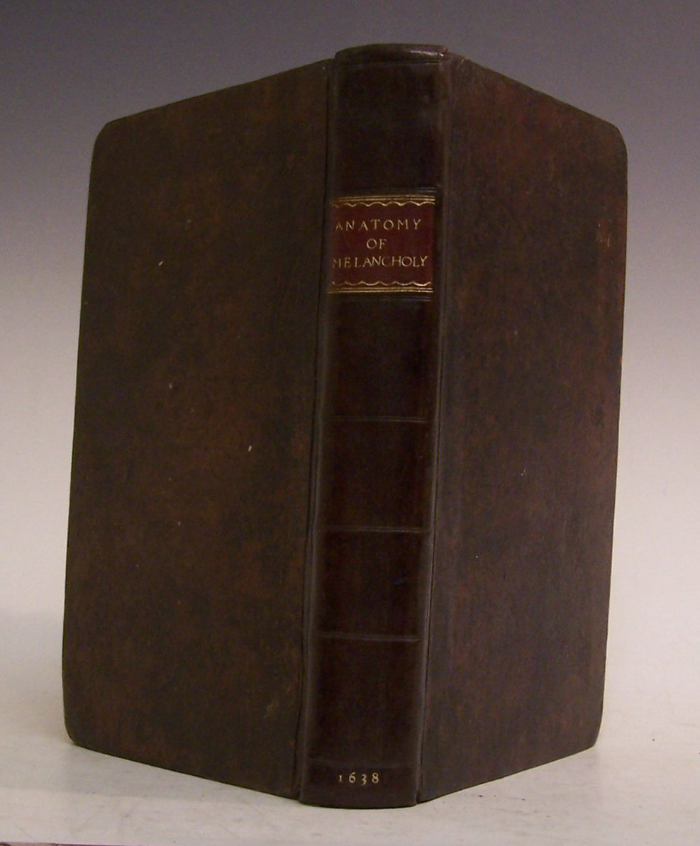 The Anatomy of Melancholy. What it is... the fifth edition. Oxford: Printed for Henry Cripps, 1638, 4to (270 x 170mm.), engraved title by C. le Blon, bound with the rare cancelled leaf LL1, woodcut ornaments and initials, contemporary calf, half-title/Argument of the Frontispiece leaf , *2 and *4 renewed in inner margin, half title with early ownership inscription of Jacobus ?Coven 1650, engraved title trimmed to plate-mark and mounted, marginal paper flaw to *3, some damp-staining and light soiling, primarily to preliminary leaves and F1-G1, a few minor marginal repairs, a few small rust-holes affecting a few letters, neatly rebacked