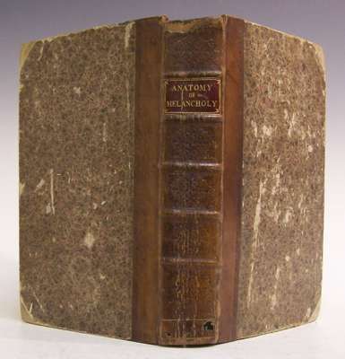 The Anatomy of Melancholy. Oxford: for Henry Cripps, 1651, sixth edition, 4to (270 x 178mm.), engraved title by C. le Blon, eighteenth-century calf-backed boards with vellum corners, title just shaved in lower corner, occasional light soiling, rusthole to 3M3 and 4Q1, head of spine rubbed