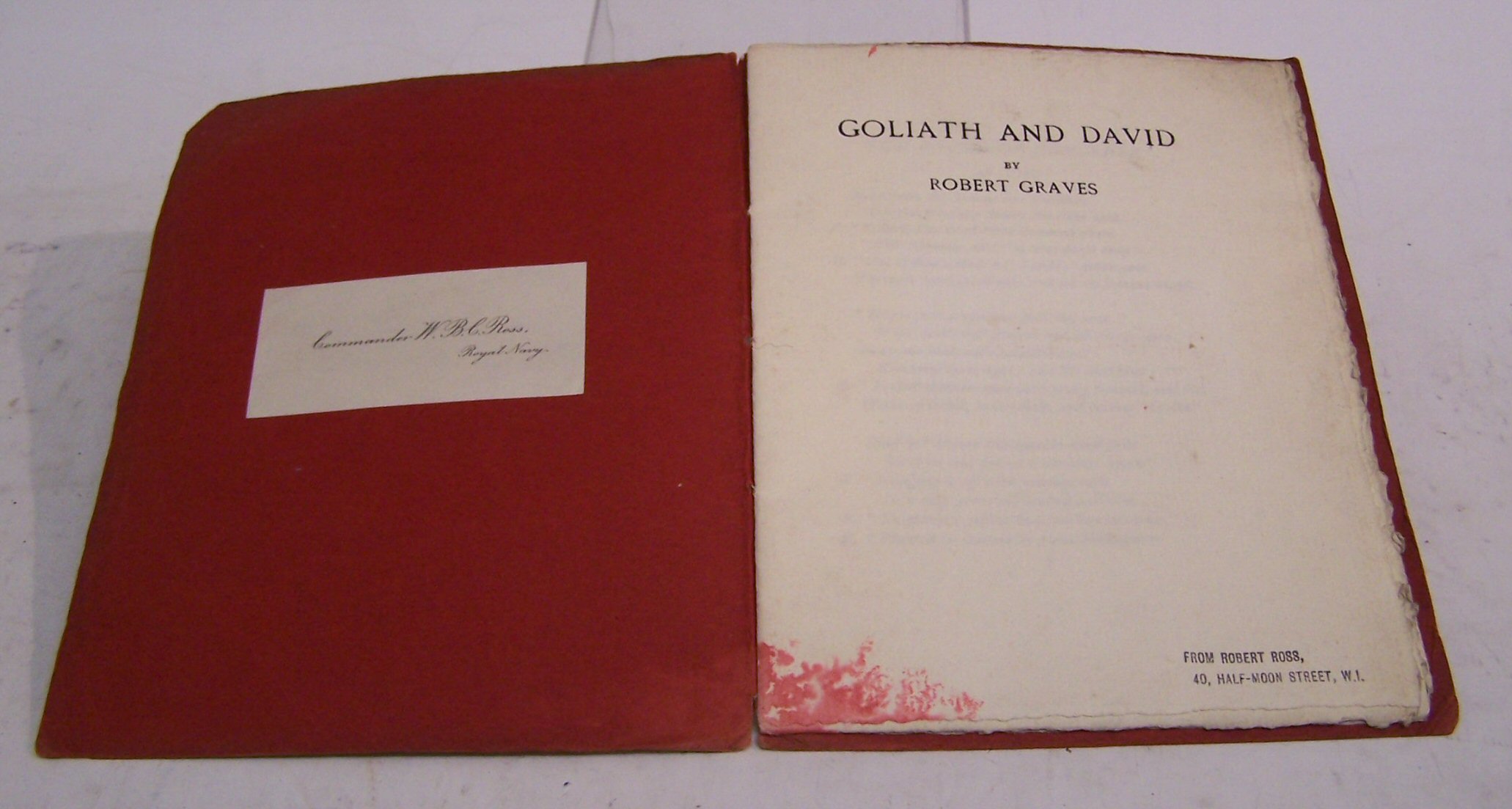 Goliath and David. London: Chiswick Press [1916]. First edition, small 8vo, 17pp, [limited to 200 copies], original red paper covers, edges faded, corners bumped, damp stain at base of spine, red colour stain throughout volume, approx 2cm high by 5cm wide at largest, owner's stamp on title