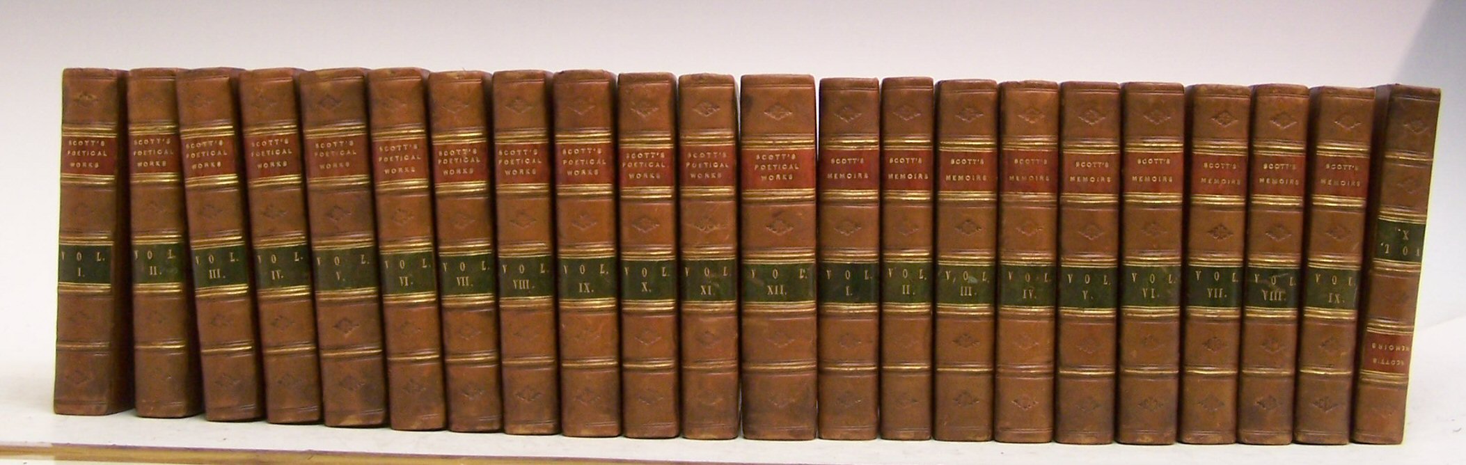 The poetical works... Edinburgh: R Cadell, 1851, 12 volumes, 8vo, each volume with engraved frontispiece and title page, contemporary half calf gilt, red and black labels, some foxing especially to engravings; Lockhart, J.G. Memoirs of the life of Sir Walter Scott, Bart. Edinburgh, A&C Black, 1853, 10 volumes, 8vo, each volume with engraved frontispiece and title pages, contemporary half calf gilt, red and green labels, foxing (22)