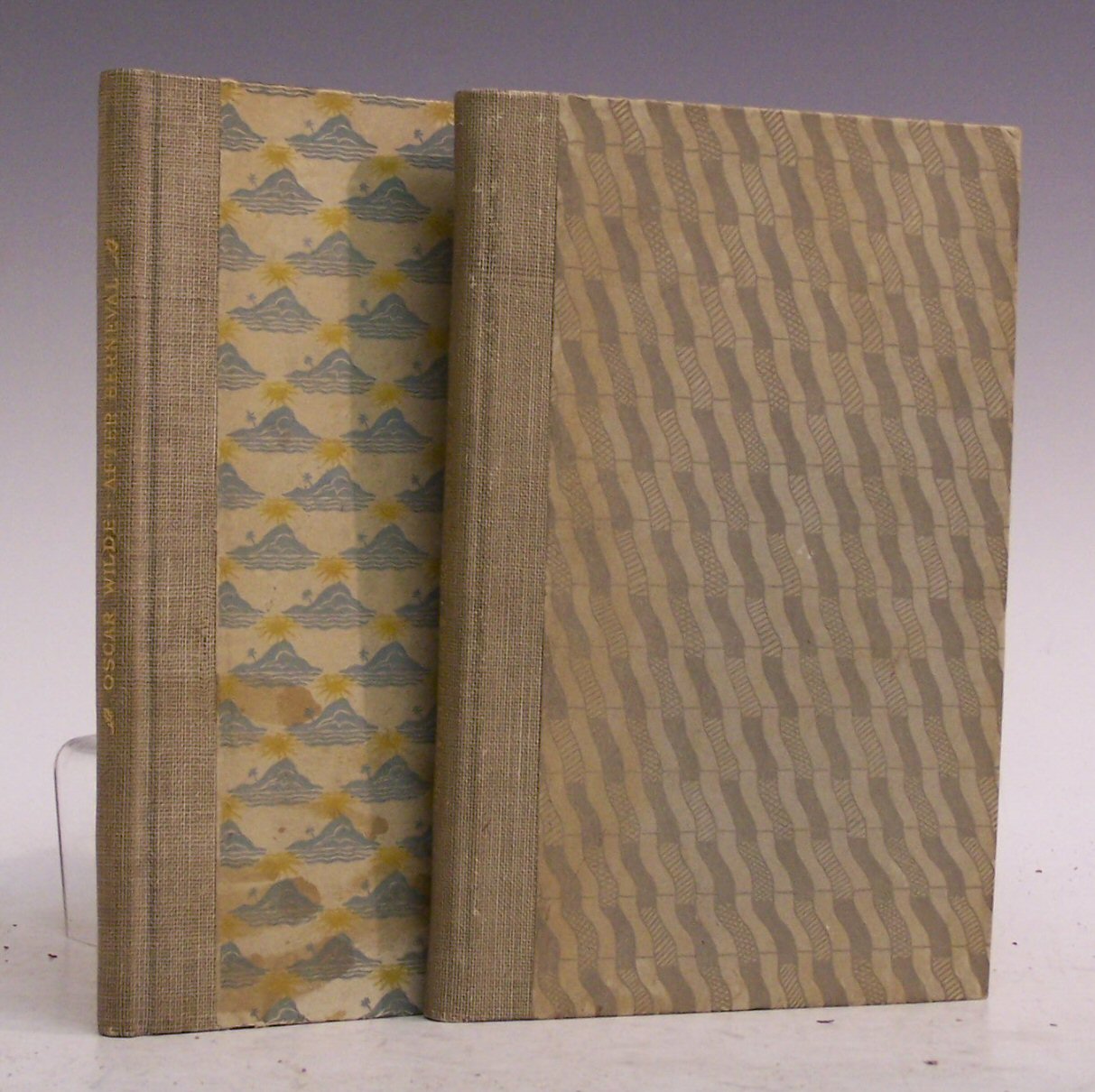 After Reading, Letters from Oscar Wilde to Robert Ross. London: The Beaumont Press, 1921, 8vo, number 84 of 400 copies, cover and decorations designed by Ethelbert White, presentation copy to Alex Ross from Wilde's son V.B. Holland, autograph letter signed from Holland to Alec Ross [Robert's brother] pasted to prelim dated April 20th 1921, further inserts throughout by Holland discussing contents of letters, original decorative paper boards, small hole to upper board, some discolouration, interior very clean; Ibid. After Berneval, Letters from Oscar Wilde to Robert Ross. London: The Beaumont Press, 1922, 8vo, number 84 of 475 copies, cover and decorations by Randolph Swabe, presentation copy from V.B. Holland to Alec Ross, autograph signed letter pasted to prelim dated April 4th 1922, further inserts throughout discussing publication/ editing of letters, original decorative paper boards, some discolouration, corners bumped, interior clean (2)