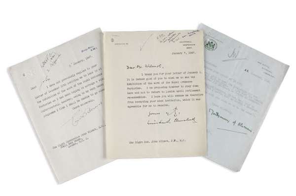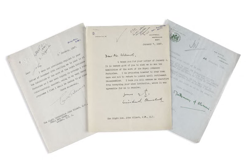 Churchill, Sir Winston. Typed letter signed to The Right Hon. John Wilmot: 'It is indeed good of you to wish me to see the Exhibition of the work of the Royal Ordnance Factories. I am proposing however to stay down here and not to return to London until Parliament re-assembles. I hope you will excuse me therefore from accepting your kind invitation, which it was agreeable for me to receive'', Chartwell paper, Jan 7, 1947, with a secretary's ink initials and note at head; Montgomery, Bernard Law, 1st Viscount Montgomery of Alamein Typed letter signed, accepting invitation to open the Exhibition at the Carlton Hotel, War Office headed paper, 22 Nov. 1946, staple holes at head; Bevin, Ernest, Minister of Foreign Affairs.Typed letter signed, to John Wilmot, apologising for not being able to visit the Exhibition, Foreign Office headed paper, 16 Jan. 1947, ink initials and note at head of page, all three letters with punch hole top left (3)