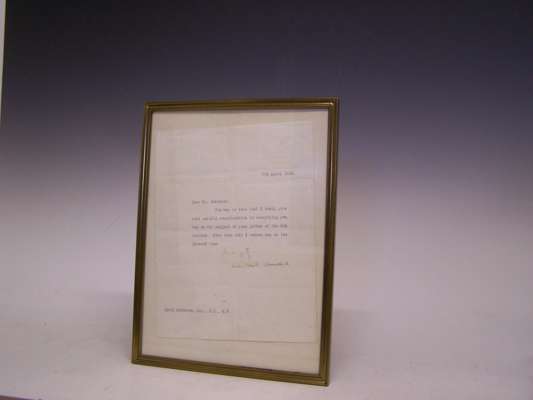 Document signed to Sir Cyril Atkinson M.P. dated 7th April 1928, "You may be sure that I shall give most careful consideration to everything you say on the suject of your letter of the 4th instant. More than that I cannot say at the present time." Single leaf, Treasury Chambers stamped paper, previous folds, some staining affecting ink signature