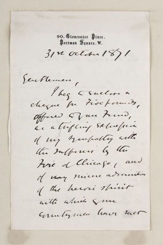 Autograph letter signed, to the Committee of the American Chicago Relief Fund, with a contribution and praise of ''the heroic spirit'' shown by the survivors of the Chicago fire, 2 pages, 31 October 1871, tipped on to card