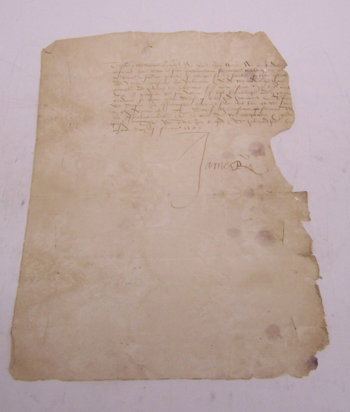 Letter signed, 1 page, folio, large signature, dated 9th February 1580/1 Holyrood House, to [William Keith] the Earl Marischal of Scotland, calling him to arms having been "credible informit that there is sum preparation of armes... in sundrie partis of ewrope...", small section torn on right hand side, dispatch slits, some water staining
