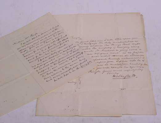Two autograph signed letters, to Mrs Pringle of Whytebank, undated, addressed Abbotsford, the first regarding congratulating her on the forthcoming marriage, the second regarding a visit to Mrs Pringle the following evening with "my present guest Mr Nicolson, a young artist, a very modest young man of great merit", both single sheet folded, wax seal partially intact, some tears to edges (2)