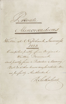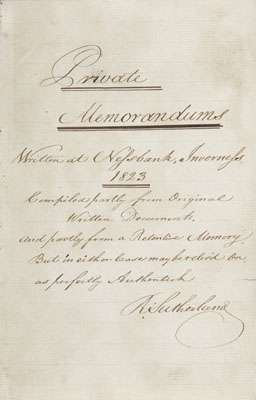 Private Memorandum book of Captain Robert Sutherland of Nessbank, formerly of the 72nd Regiment of Foot, commencing 'I Robert Sutherland, was born at Taumachy in the Parish of Rogart, County of Sutherland, in the month of June 1760.' In 1798 Sutherland describes his return after '11 years in the East Indies, with £7600 in Bills payable' having obtained the rank of Captain, detailing his loss of money through the financial advice of Sir John Lubbock, his posting with his Regiment to Ireland in 1800, and appointment as Captain of one of the Companies of Independent Invalids at the Tower of London. In 1801 he journeys north from Findhorn to Dornoch, the prospect of war with France requiring him in 1803 to rejoin the Invalids at Edinburgh and then Stirling Castle. In 1806 Doctor James Straith purchases a house for him at Forres for £700, in 1807 he spends the summer with his Father in law, the Rev. Doctor Bethune, Minister of Dornoch, and in 1808 purchases rashly the Farm of Drummey in the Parish of Golspey : 'by this precipitate measure I must give up my comfortable house at Forres and commence Farmer, a profession of which I had no practical knowledge''. On 8th August 1809 he reports at length on the Meikle Ferry accident when the ferry was crossing from the coast of Sutherland to the Ross-shire coast carrying passengers for a market to be held in Tain: 'persons crowded into the Ferry Boat [which] sunk in a few minutes after setting off, by which misfortune 99 persons were drowned, 12 only being saved out of all the number that embarked… We held a meeting of the few respectable people that could be assembled at Dornoch to consider of a subscription for collecting & burying the dead bodies & to stimulate the exertion of the fishers and country people to discover and to search along the shore for such as the sea might cast up… all but four or five who were probably covered by the sand, were decently buried in the churchyard of Dornoch… The expense incurred on this account, as well as the great distress occasioned by the loss of Fathers, Mothers, and others, who were the Support of whole Families, now become destitute, rendered further measures and great exertions necessary.' A committee is formed, Sutherland being appointed chairman. 'Subscriptions were received from every part of Scotland, a good many from England and some from the East Indies as well as the Cape of Good Hope. In whole £3400 was collected of which nearly £3000 were distributed amongst the sufferers in the most exceptional manner.'' This disaster prompted the building of the bridge at Bonar Bridge in 1812.1811 has the laconic comment ''Nothing particular occurred for some years''. 1816 refers to the return of Doctor Walter Ross Munro from Calcutta, and his death, his 'will [being] contested by his widow'.In 1816 the 'crops were universally bad and late and were not cut down until November. The produce very deficient, the quality bad, and great apprehension entertained of a scarcity - if not of famine, all over the County'. 'From the failure of last year's crop I gave away a considerable quantity of victual to poor people in the utmost distress, who could not pay for it.' Sutherland gives detailed accounts of his investments, especially financial mistakes 'in an unguarded moment I was tempted to sell out of the stocks and purchase the estate of Flemington in the parish of Ayton, Berwickshire, consisting of about 163 English acres, and rented at £620 per annum, for which I was to pay £11,800. He gives precise details of his will and Trust disposition and its beneficiaries, and reviews, with no little satisfaction, his financial and social position "possessed of a landed estate of nearly £600 of yearly rent… respected and universally esteemed by all classes of my countrymen.. in favour with the Noble Family of Stafford… appointed a Deputy Lieutenant, a Justice of the Peace, a Trustee of the Roads and a Magistrate of Dornoch.'Although evidently not prepared to criticize Lord Stafford, Sutherland refers to the effect of the highland clearances: 'The situation of the Sutherland tenantry becoming every year more circumscribed in consequences of the new system adopted by Lord Stafford, and his managers, in placing the Estate of Sutherland under sheep - instead of being under cultivation as hitherto - my half brother resolved to leave the County, and embarked in the month of May, for Picton, Nova Soctia, with his family, and was accompanied by Andrew Sutherland & his family, with several others from Sutherland, for whom I hired a vessel from Aberdeen. I assisted both John and Andrew to pay their passage, as well as to procure many things useful to them'1820 refers to great alarm among agriculturalists, 'cattle & every description of farm produce fell in price' and 'a great outcry against high rents… there being no chance of the same high prices which were obtained during the war' In 1821 Sutherland abandons farming, sells the lease of Drummey and moves to Inverness, building a new House, naming it 'Nessbank, from its situation on the Bank of the Ness'. 1821 refers to a relation gone to New South Wales 'now comfortably settled in Van Diemans Land' and 1822 to Duncan Campbell embarking for Picton, Nova Scotia. Sutherland provides detailed accounts of the sale of Drummey (£2800 1s 3d), the purchase and building of Nessbank (£1220) and of the costs of three further houses built at Nessbank (£2289 5s 6d). He lists all his relations with their names and place of residence, detailing all the legacies made to them, and his investments in consoles, the Inverness Gas & Water Co. and the Scots Union Insurance Co.. The final entry, on 15 December 1827, states that he will not call upon the Principle of the Heritable Bond for £5000 from Major Fraser Newton for five years (if I live so long). An obituary of 'Captain Robert Sutherland of Nessbank formerly of the 72nd Regiment of Foot, appears in the Inverness Courier of 30 Ja