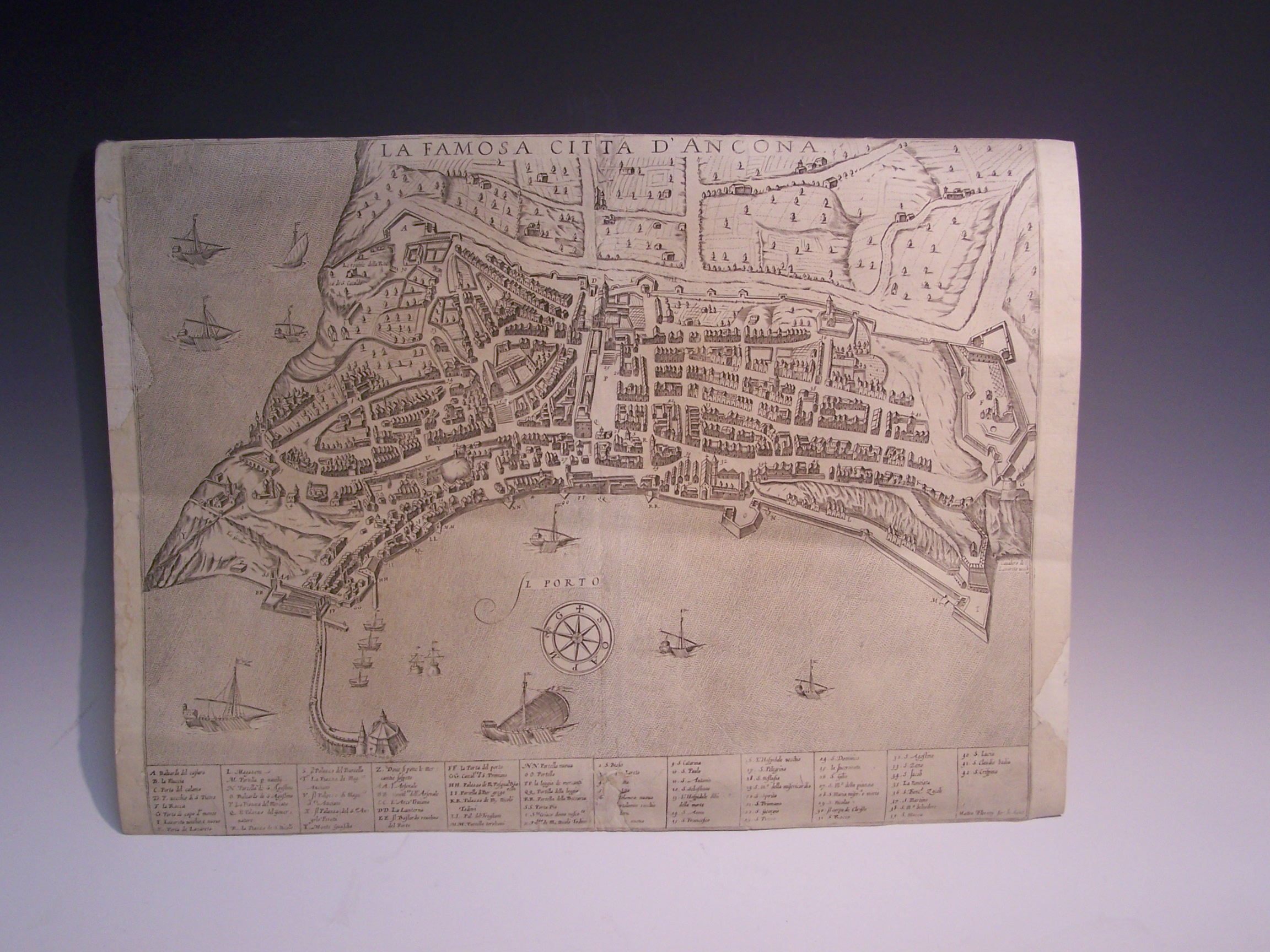 La Famosa citta d'Ancona. [Siena]: Matteo Florimi, [c.1600], 390 x 495mm., full-page engraved bird's-eye view of the town, with key below, printer's crease and an area of sea restored, with manuscript reinstatement, part of the key infilled, repaired tear; Art An alphabet of gods and goddesses. No date, 8vo, 29 ink and watercolour paintings each with a corresponding poem in ink, full vellum with ties, red pencil marks on rear board (2)