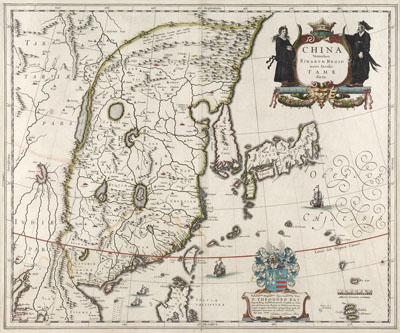 China veteribus sinarum regio nunc Incolis tame dicta. Amsterdam, c.1635, hand coloured, decorative cartouche, image 51cm wide by 42cm high, framed and glazed, previous folds, possible repair to lower section of fold, very occasional spotting