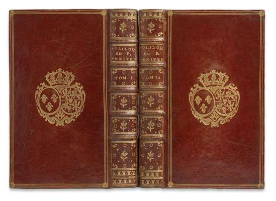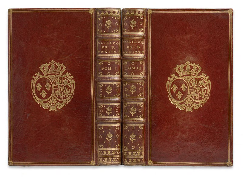 Les soliloques du pecheur pénitent avec Jésus souffrant. Lyon: Jacquenod & Rusand, 1766, 2 volumes, 12mo (169 x 95mm.), contemporary French red morocco gilt, three-line border, Arms of Marie Leczinska, Queen of Louis XV on boards, spines gilt in compartments, gilt edges, blue silk endpapers, very slight wear at edges