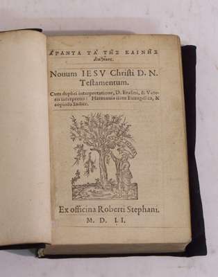 [Greek title] Novum Jesu Christi D.N. Testamentum cum duplici interpretatione, D. Erasmi, & veteris interpretis; Harmonia item evangelica, & copioso indice. [Geneva]: ex officina Roberti Stephani, 1551, small 8vo, pp. [iv], 463, verso blank, text in two columns of Greek and Latin, printer's woodcut device on the title, ruled in red throughout, modern soft calf binding, lacking the Harmonia & indices