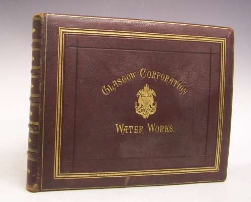 Photographic views of Loch Katrine and some of the principal works constructed for introducing the water of Loch Katrine into the city of Glasgow. Glasgow: Glasgow Corporation Water Works, 1877, oblong folio, 33 albumen prints, images approx 28cm wide by 21cm high, printed inscription below each image, original full red morocco gilt, some rubbing to edges, some tearing on upper board, occassional foxing