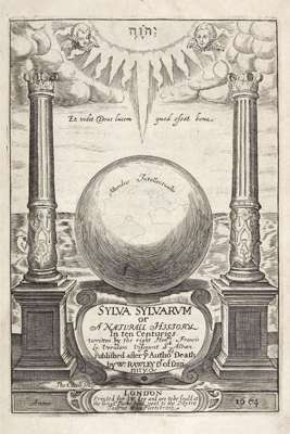 Sylva sylvarum. or a natural history in ten centuries. London: for W. Lee, 1664. Eighth edition, folio, frontispiece, engraved title, pp. [16] 218 [21], woodcut ornament [bound with] New Atlantis, a work unfinished, woodcut head-pieces, pp. 36 [ with] History natural and experimental of life and death. London, 1664, woodcut ornament, pp. [8] 64 [with] Articles of enquiry touching metals and minerals. London, 1662, woodcut ornament, pp. 221-228, contemporary calf, worn, boards loose, some staining to top right edge of interior