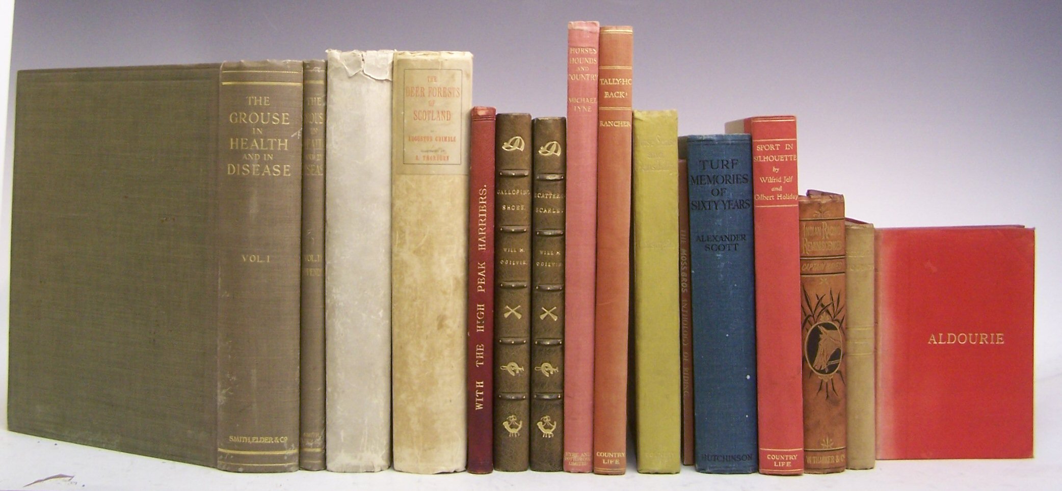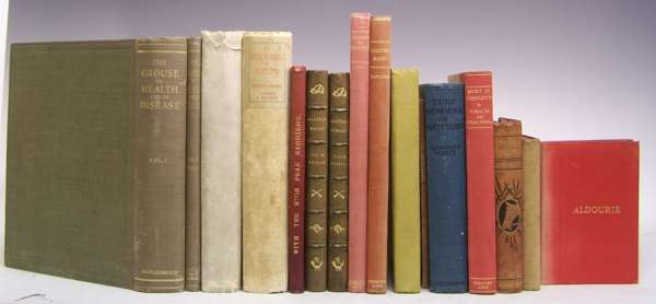 Highland Sport. London, 1894, 4to, illustrated by Archibald Thorburn, 10 [of 11] plates, contemporary quarter vellum, worn, some plates loose with chipping to edges; Ibid The deer forests of Scotland. London, 1896, 4to, one of 500 copies, illustrated by Thorburn, 8 plates, contemporary quarter vellum gilt, worn, ink spot to upper board, foxing to some plates; Grouse The grouse in health and in disease. London, 1911, 4to, two volumes, illustrated, original cloth gilt, slight rubbing, some foxing; Derbyshire Hunting A third of a century with the High Peak Harriers. Buxton, 1892, 8vo, copy number 99, illustrated, contemporary full red morocco gilt, some rubbing to edges, some spotting; Ogilvie, W.H. Galloping shoes. London, 1923. Second edition, 8vo, illustrated by Lionel Edwards, 8 tipped-in plates, later half green morocco gilt, sunned, interior clean; Ibid Scattered scarlet. London, 1923. First edition, 8vo, illustrated by Lionel Edwards, 8 tipped-in plates, later half green morocco gilt, sunned, foxing and 48 others on the subject of hunting (55)