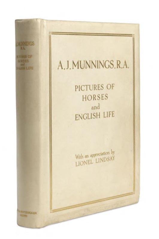A.J. Munnings R.A., Pictures of horses and English life. London: Eyre & Spottiswoode, 1927, 4to, number 208 of 250 copies, signed by artist, colour frontispiece, illustrations, original vellum gilt, a fine copy