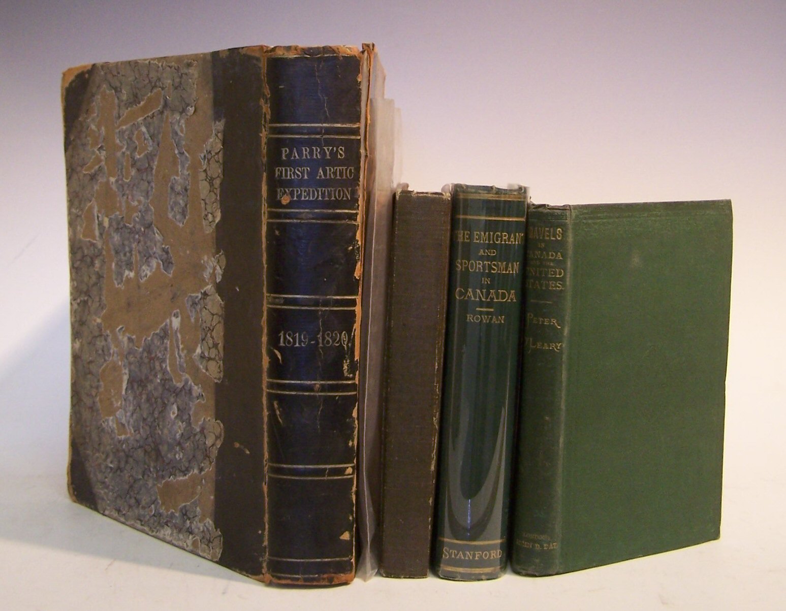Journal of a Voyage for the Discovery of a North-West Passage from the Atlantic to the Pacific; Performed in the years 1819-1820, in His Majesty's Ships Hecla and Griper. London, 1821. First edition, 4to (270 x 210mm.), 14 aquatint or engraved plates, 6 charts and maps, 4 folding, contemporary half sheep over marbled boards, some slight foxing and offsetting, binding rubbed at extremities; Rowan, J.J. The Emigrant and Sportsman in Canada. London, 1876. First edition, 8vo, folding map, original cloth, very slightly rubbed; O'Leary, Peter. Travels and Experiences in Canada, the Red River Territory, and the United States. London: J.B. Day, [1877], 8vo, advertisements, original cloth, binding slightly worn and 2 others (Montreal Illustrated; or the stranger's guide to Montreal, 1875, and a photo album c.1900) (5)