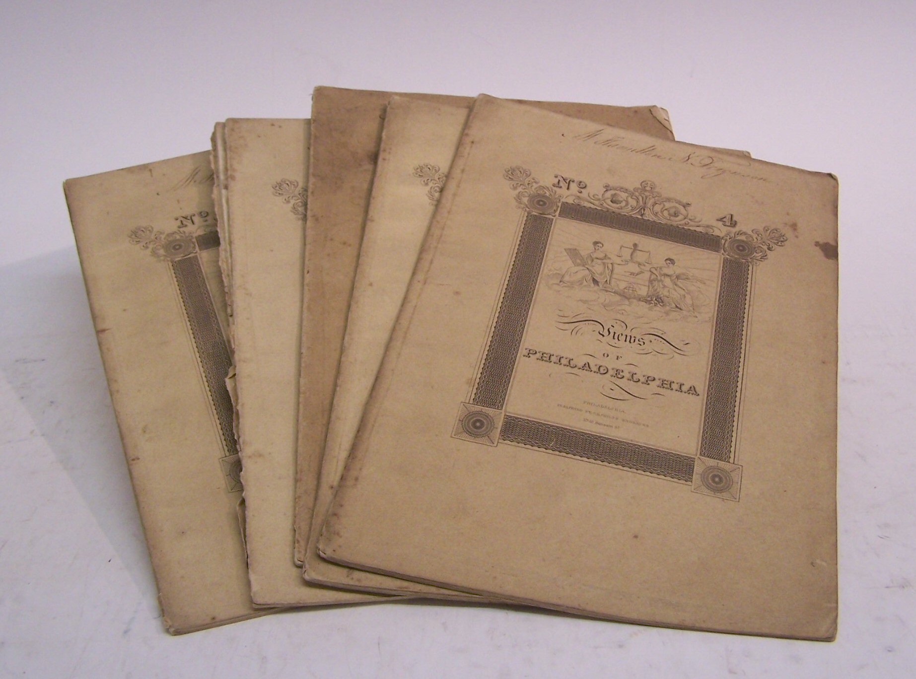 Views in Philadelphia and its vicinity; engraved from original drawings by Doughty, Birch, Strickland, Haviland and Leaman. Philadelphia: C.G. Childs, 1827-30, small folio, 5 [of 6 volumes], 21 engraved plates [including plan in volume 5] with corresponding letterpress, volume 6 with engraved title and list of subscribers, tissue guards, original printed paper wrappers, foxing, volume 6 lacking backstrip, owner's ink inscription to each upper wrapper, foxing to interiors