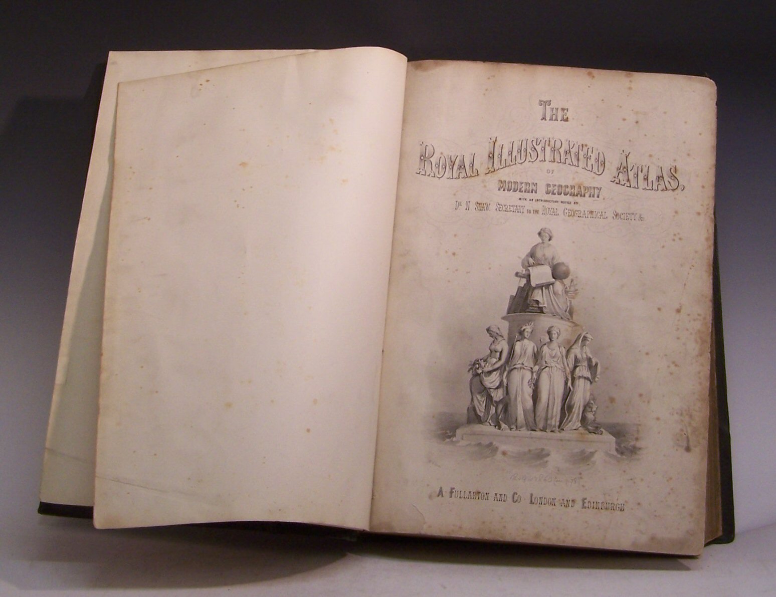 The Royal Illustrated Atlas of Modern Geography. London: A. Fullerton and Co, [c. 1865], folio, 76 lithograph maps [74 numbered plus 2 supplemental], engraved title, contemporary half green morocco gilt, a.e.g., marble endpapers, bookplate of John George Bartholomew, rubbed, inner hinges strengthened, foxing to title page,browning throughout, map 31 torn along centre fold, some small tears to edges of other maps