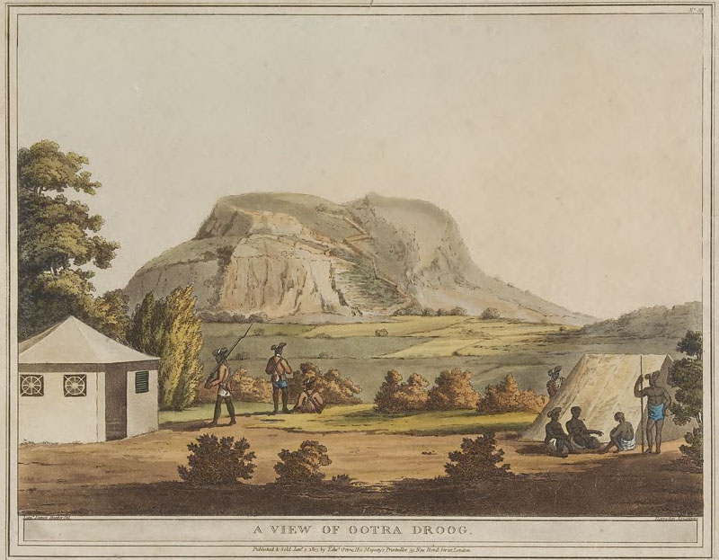 Kistnaghurry. London: Edward Orme, 1804, hand coloured aquatint, approx 35cm wide by 29cm high, framed and glazed, some small mould patches, mount heavily foxed [not on image]; Ibid A view of Ootra Droog. London: Edward Orme, 1805, hand coloured aquatint, approx 33.5cm wide by 28cm high, framed and glazed, small tear in upper margin, some spotting in lower margin, mount heavily foxed; Ward, Francis Swain A view from the King's barracks, Fort St George. London: Edward Orme, 1804, hand coloured aquatint, approx 42cm wide by 29.5cm high, framed and glazed, mount foxed (3)