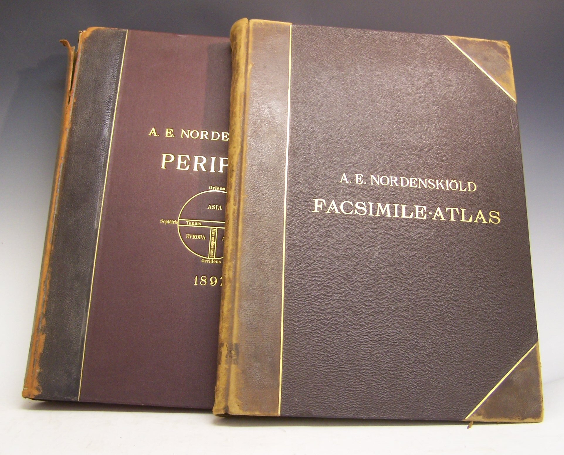 Facsimile Atlas to the early history of cartography with reproductions of the most important maps printed in the XV and XVI centuries. Stockholm, 1889, folio, translated from the Swedish by Johan Adolf Ekelof, 51 full sheet cartographical facsimiles, contemporary morocco gilt, worn, inner hinges strengthened, interior clean; Ibid Periplus an essay on the early history of charts and sailing directions. Stockholm, 1897, folio, 60 full page facsimile charts contemporary morocco gilt, worn, hinges splitting, small section lacking from head of backstrip, interior clean (2)