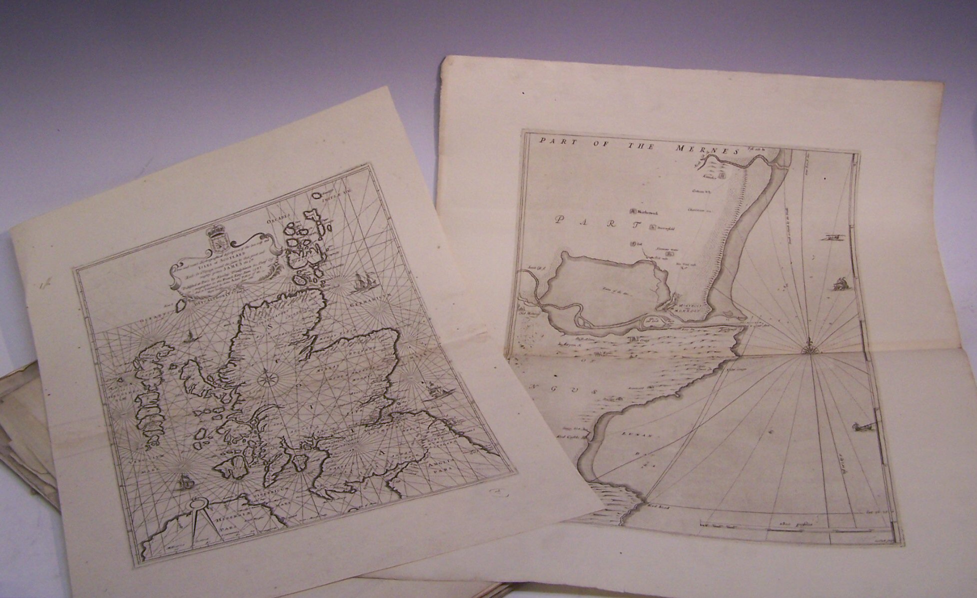 The Frith of Forth. [Edinburgh, 1703], size 71cm wide by 51cm high, uncoloured, previous folds; Ibid The Frith and River of Tay. [Edinburgh, 1703], size 75cm wide by 52cm high, uncoloured, previous folds, stain at centre fold; Ibid Holy-Island, Fairn Islands with the many Rocks and Hazards that lye Scatter'd in that Sea, and the Coast from Sunderland point in England to St Abbs-head in Scotland. [Edinburgh, 1703], size 59.5cm wide by 48cm high, uncoloured, discolouration at centre fold; Ibid A true and exact Hydrographical description of the Sea coast and Isles of Scotland. [Edinburgh, 1688], size 39cm wide by 52cm high, uncoloured, previous fold; Ibid The Town and water of Montross. [Edinburgh], 1693, size 47cm wide by 59cm high, previous fold; Ibid The coast of Scotland from Redhead to Aberdeen. [Edinburgh, 1703], size 47cm by 60cm, uncoloured, previous fold, section lacking in top right hand corner [no loss to map]; Paterson, G. & W. A survey of old and new Aberdeen. London, 1746, size 53cm wide by 40cm high, previous fold, some foxing and 7 other uncoloured maps of Scotland mainly by Blaeu (14)