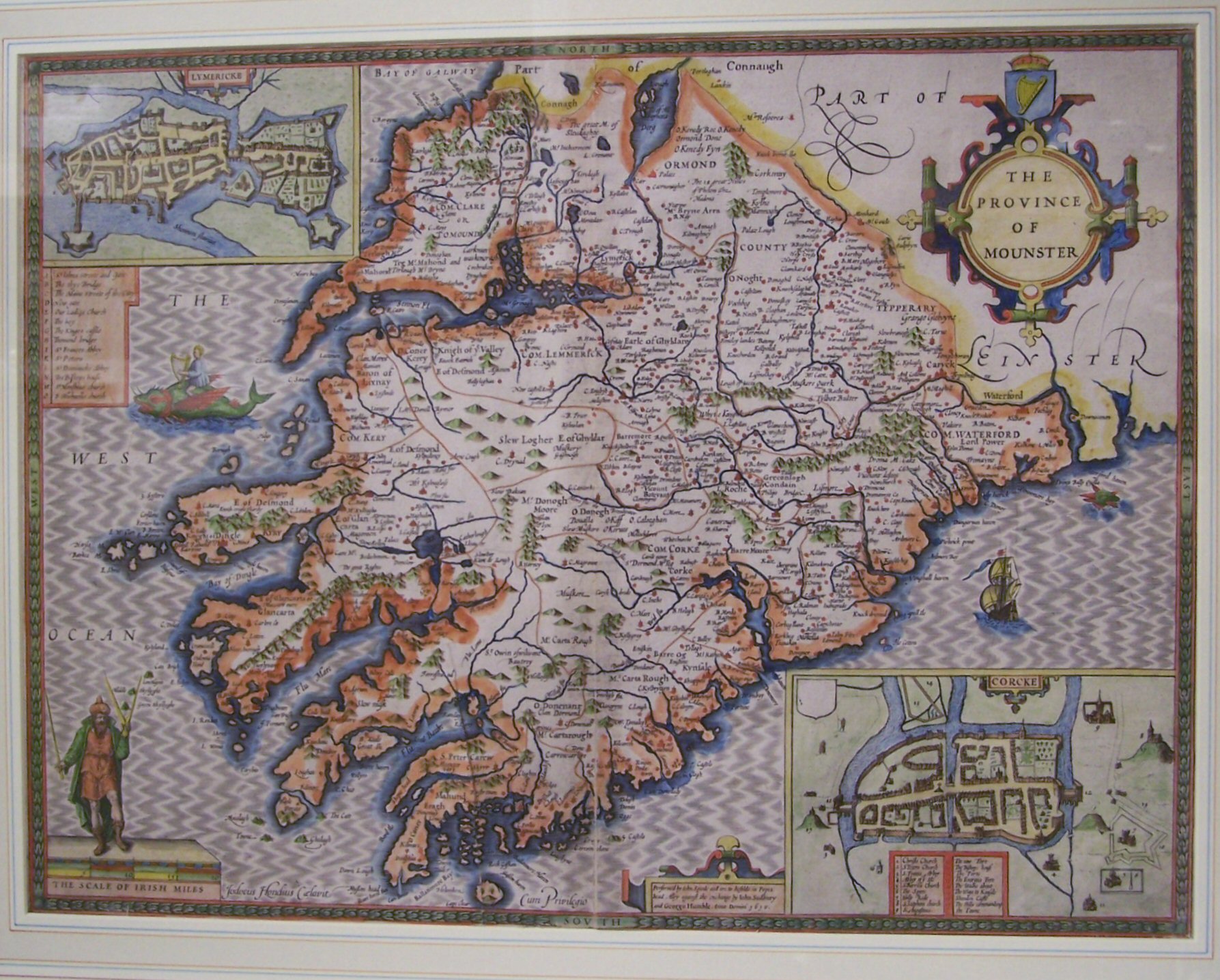 The Province of Mounster [Ireland], double-page hand-coloured engraved map, inset view of Limerick and Cork, English text on verso, 38.5 x 51cm., John Sudbury and George Humble, [1610-27]