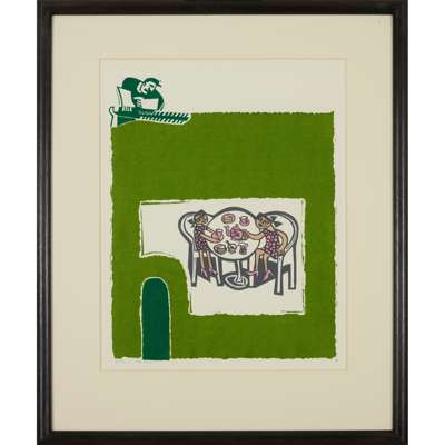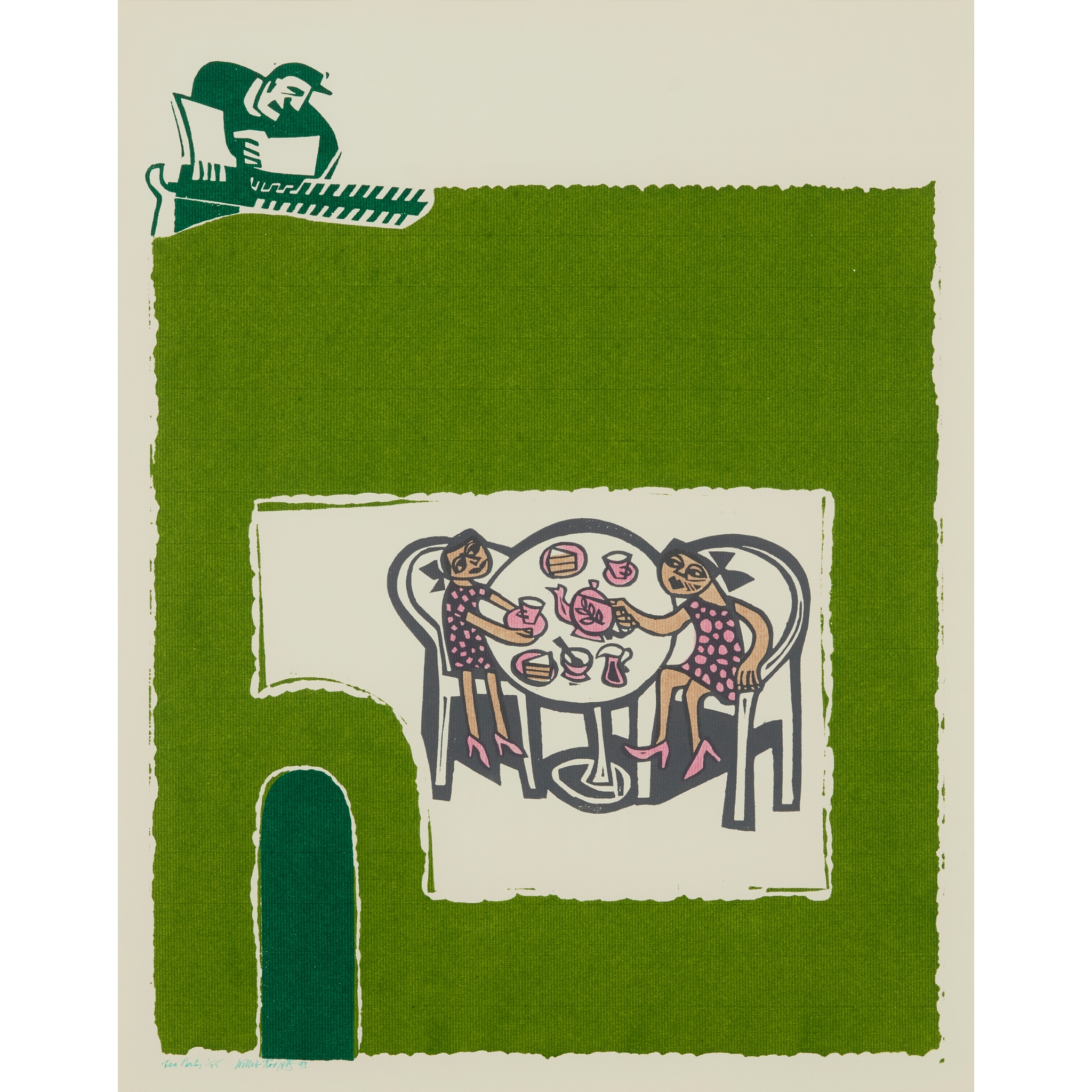 Linocut, 1/25, signed, dated, titled and editioned in green ink to margin