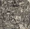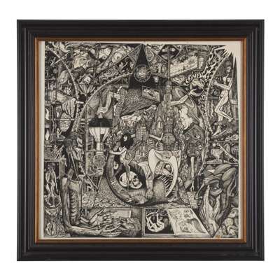 Gray’s ‘Faust in his Study’ is a work that showcases his witty and bold graphic style. The scene is a chaotic one, which finds its origins in the original painting by Rembrandt, c. 1652, of the same name. In Rembrandt’s work, a scholar is transfixed by an orb of light that holds a secret code. In Gray’s version, all the knowledge of life swirls around this incredibly detailed work, intertwining symbols of death, love and the human experience. Gray has said that the figure of Faust ‘is an idealised version of me, busily introspecting.’ As the original tracing cloth has been lost, only a few dyeline prints and photocopies of this work exist. However, as The Guardian proclaimed ‘A peculiarity of Gray’s graphic work is that it sometimes appears at its best in reproduction.’