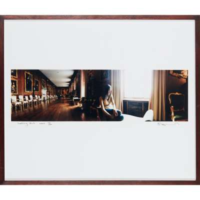 YBA artist Sam Taylor-Johnson is perhaps best-known for her 2002 National Portrait Gallery commission to depict David Beckham, where she presented a film of him sleeping. One significant body of work is her 'Five Revolutionary Seconds' series, where she uses a panoramic camera to take a full 360° image of an interior during a five second exposure. In ‘Looking Out,’ created especially for Counter Editions, Taylor-Johnson returns to this format, though the final print is a 120 degree span, taken from the full 360 degree shot. It depicts British actress Thandie Newton in the Picture gallery of Althorp House, ancestral home to the Spencer family and resting place of Diana, Princess of Wales. Taylor-Johnson comments ‘I wanted someone who was achingly beautiful in a surrounding that was equally achingly beautiful, but for the two to be slightly incongruous.’ Newton is physically present within the room but visually her modernity contrasts with its historic interior while she is centred in the change of light from the exterior bright sunshine to the internal shadows, her presence is an unexplained, liminal space, compelling the viewer in.