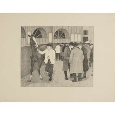 Bevan was a highly-skilled horseman and his images of horses are amongst the most celebrated of his oeuvre. He would sketch during the horse sales in London, where he enjoyed the interaction between people and animals as much as the pace and spectacle of the event. This interest expanded into his printmaking practice and can be seen in lithographs such as Horse Dealers (Ward’s Repository No.1) (lot 38), The Horse Mart (Barbican No. 1) (lot 37) and Horse Dealers at the Barbican (Barbican No.2) (lot 39) produced from 1919 to 1921. Crocks of 1925 (lot 40) was his final lithograph and shows a pair of horses having been taken out of a cab’s shafts and led to a trough for a drink.