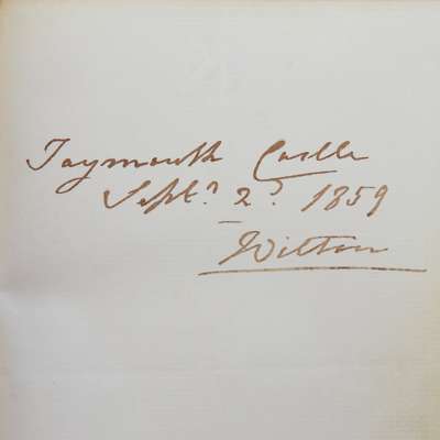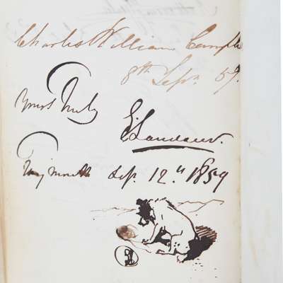 signed twice by Edwin Landseer, 1859, with ink drawing of a dog, and 1860, the Earl and Countess of Derby, Lord Ashburnham, the Earl of Haddington, Lord Falkland, Caroline Norton, with autograph poem, 1860, and members of the Baillie, Baillie-Hamilton, Douglas, Beauclerk, Ashley, MacGregor and Motley families, amongst others, tartan cloth binding with brass plaque "Marie" on upper cover, gilt edges, slightly worn