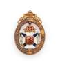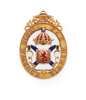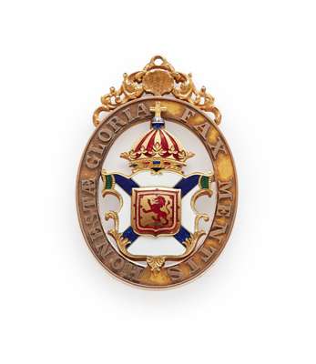 unmarked, of oval outline, the outer garter in blue enamel with gold lettering reading ‘HONESTAE GLORIA FAX. MENTIS’, enclosing a saltire enamelled central shield with lion rampant within and crown surmount, with foliate and shell suspension