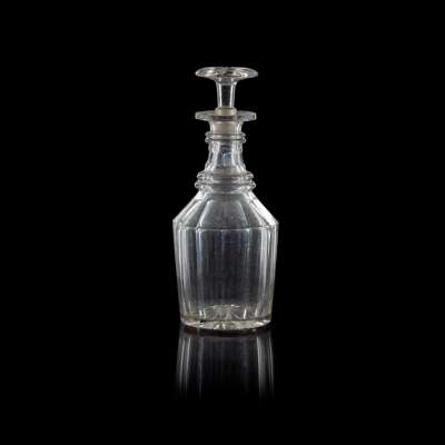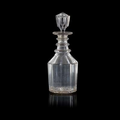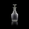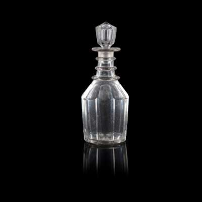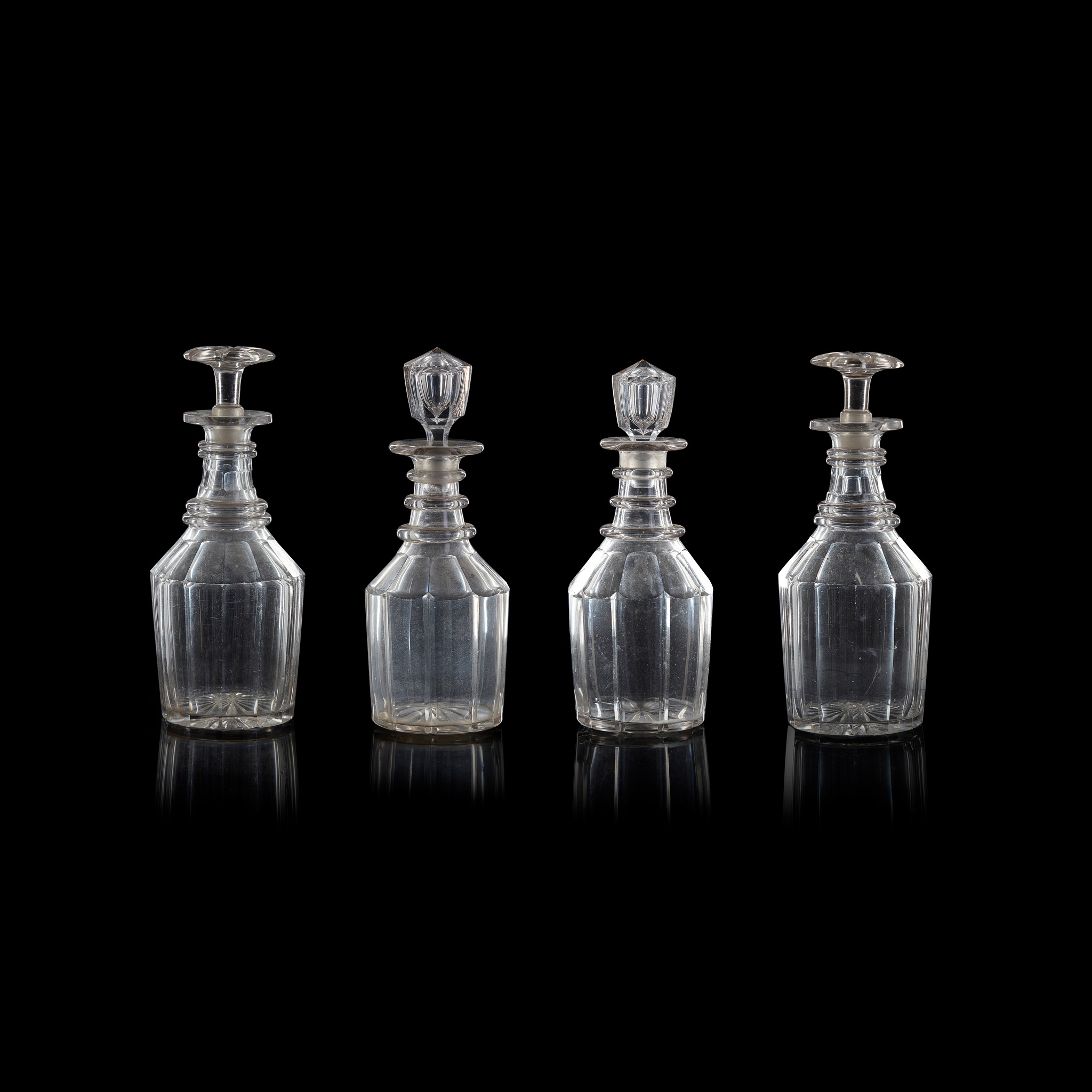 one pair of decanters each with facet cut body, triple ring neck, surmounted with a faceted hexagonal form pointed stopper, 29cm high, the other pair each with a facet cut body, the neck with two pairs of double neck rings, with a matched flat mushroom-shaped star cut stopper