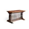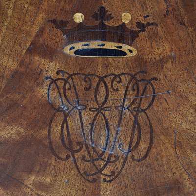the rectangular banded top with a moulded edge and centrally inlaid in two places with a coronet entwined C and B, the cipher of the Marquess of Breadalbane, above a foliate arcaded frieze raised on an H-form base with turned spindle supports and trestle bases carved with acanthus and scrolls with castors below