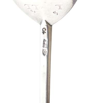 maker's mark orb and cross, London 1585, the cast Master apostle with dove nimbus, reverse of bowl with initals L* LL