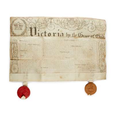 of Stokes, Heydon, and other lands in Wiltshire, with subjects in Gloucestershire and elsewhere, 20th July 1615, with Great Seal of England appended, badly worn/faded, a few small holes at folds, vellum document on 2 sheets c. 56 x 70cm., great seal 155mm. in diameter; Letters Patent given by Queen Victoria, reappointing Charles Coggins to the office of Messenger of the Duchy of Lancaster, vellum document, 49 x 75cm., with elaborate pictorial border, 2 wax seals (red and yellow) of the Duchy of Lancaster appended, in metal skippets, 2nd September 1837 (2)