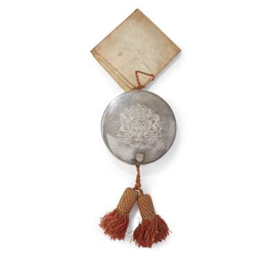 Francis Garthorne, London circa 1726, of conventional circular outline, with reeded foot, the cover finely engraved with the arms of George I, within housed the great seal of George I (broken), attached by red silk and bullion corded tassels, to a vellum commission to John Lord Glenorchy granting him plenipotentiary power to act as ambassador, Kensington, 27 July 1726, signed at head, vellum document, 56 x 31cm.