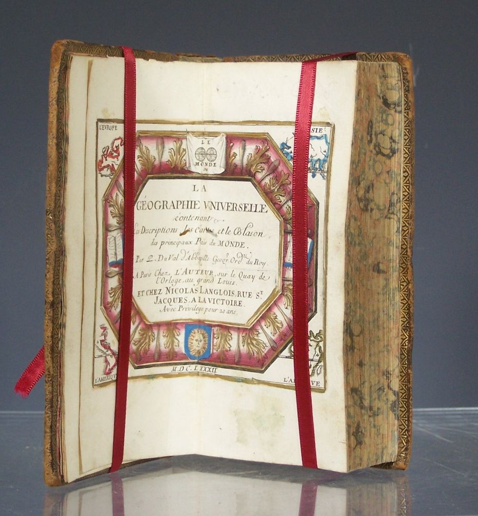 La geographie du temps. Paris: N. Langlois, 1682, 2 volumes, 8vo, one engraved title (of 2), 80 (of 82) engraved maps hand-coloured in outline, 11 (of 39) engraved coats-of-arms, and 1 engraved list of maps, contemporary calf, volume 2 dampstained and worn, slight worming at beginning of volume 1 affecting two maps and engraved list of maps and title