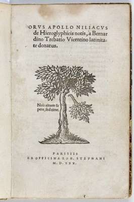 De hieroglyphicis notis, a Bernardino Trebatio Vicentino latinitate donatus. Paris: Robert Estienne, 1530, 8vo. ff. 28 (iv), printer's falling branch device on title, 19th century quarter vellum, marbled boards, corners worn, faint contemporary 12 line manuscript annotations on verso of last leaf, small stain to upper margin of first few leaves