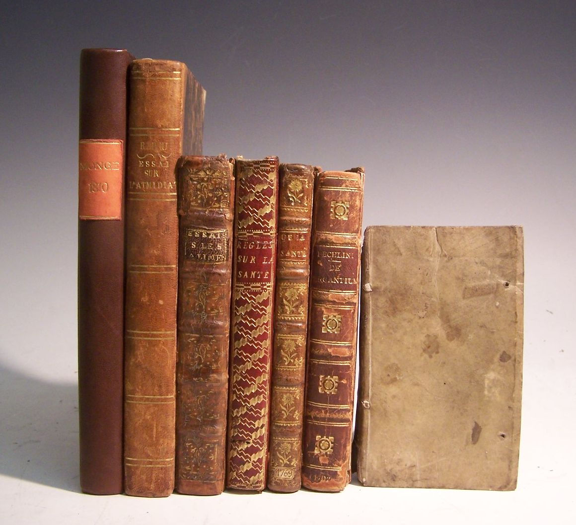 Tractatus de globis coelesti et terrestri. Frankfurt-am-Main: D. & D. Aubrios & C. Schleichium, 1627, 12mo, contemporary vellum, light browning, spine ends worn with slight loss; Pechlin, J.N. De purantium medicamentorum facultatibus exercitatio nova. Amsterdam: J. Wolters, 1702, 8vo, title printed in red and black, engraved frontispiece, contemporary calf, once rebacked, worn, cover detached; Arbuthnot, John Essai sur la nature, et le choix des alimens. Paris: G. Cavelier, 1741, part 1 only, 12mo, contemporary calf, some early marginalia, rubbed; Cheyne, George Regles sur la santé et sur les moyens de prolonger la vie. Brussels: J. Leonard, 1727, 12mo, title printed in red and black, contemporary red morocco-backed boards, spine gilt, slight spotting, extremities rubbed; Tissot, Samuel De la santé des gens de lettres. Lausanne: J.F. Bassompierre, 1769, 12mo, contemporary mottled calf, spine gilt, neat repair to head of spine and corners; Rapou, T. Essai sur l'atmidiatrique. Paris: Gabon, 1819, 8vo, 2 engraved plates, contemporary calf-backed boards, vellum corners; Monge, Gaspard Traité élémentaire de statique. Paris: Courcier, 1810, 8vo, 5 folding engraved plates, recent calf-backed boards (7)