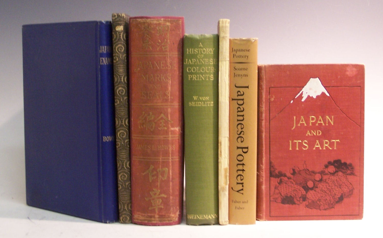 Piggott, F.T. Studies in the decorative art of Japan. London, 1910, 4to, illustrated, original decorative cloth; Bowes, James Japanese marks and seals. London, [no date], 8vo, illustrated, original red cloth gilt, rebacked, repairs throughout; Seidlitz, W. von A history of Japanese colour-prints. London, 1910, 8vo, illustrated, original green cloth gilt, a very good copy; Bowes, James Notes on Shippo. Liverpool, 1895, 4to, illustrated, original paper covers, lacking backstrip [tape repairs], some leaves loose; Huish, Marcus Japan and its art. London, [no date], third edition, 8vo, illustrated, original decorative red cloth gilt, fading to backstrip; Jenyns, Soame Japanese pottery. London, 1971, first edition, 8vo, original cloth gilt, dustwrapper, some fading and 37 others on Japanese art reference, mainly 20th century (44)