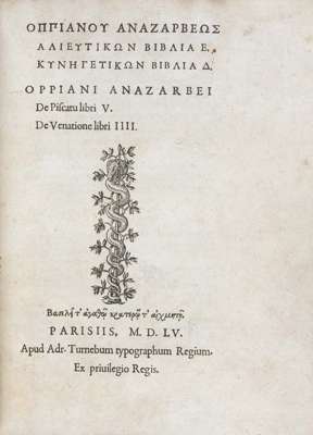 Note: "One of the most beautiful books Turnebus ever printed: its rarity and intrinsic value are equal to its elegance" (Dibdin.) Oppian composed his elegant Greek verses on hunting and fishing in the late 2nd century. They were not edited for publication until 1515 and 1517 when Junta and Aldus both produced editions.