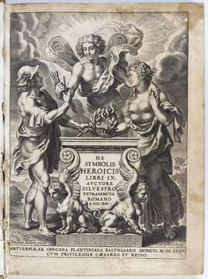 De symbolis heroicis libri IX... Antwerp: Plantin, 1634, 4to, pp. lxxx, 480, xxxvi, engraved title page after Rubens, portrait of Cardinal Aloysius Carafa, 8 engraved plates, 268 engraved devices, 13 other illustrations, contemporary vellum, later label on backstrip, some slight staining to first few leaves