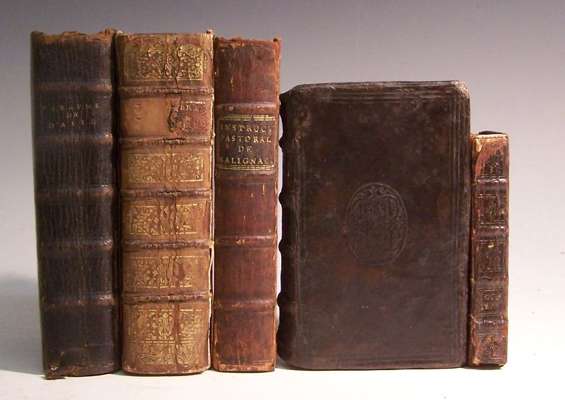 L'histoire des histoires. Paris: Marc Orry, 1599, 8vo, woodcut device on title, later calf, worn, upper cover detached, [not in Adams]; Drexel, Jerimias Aurifodina artium et scientiarum omnium. Antwerp: widow of Johannes Cnobbart, 1641, 12mo, engraved frontispiece, contemporary calf, slightly stained, worn; Fenelon, F. S. de la Mothe Instruction pastorale. Brussels: L. Marchant, 1698, 12mo, contemporary calf, slightly rubbed; Pseaumes de David traduits en François. Paris: Elie Josset, 1697, 12mo, engraved frontispiece, ruled in red, later black morocco, rubbed; Herodianus Heriodiani Romanorum imperatorum vita ac rebis gestis libri viii Graecè et Latinè. Basle: Henricus Petrus, 1563, small 8vo, contemporary blindstamped calf with central arabesque, title torn with loss of a few letters, slight wear at head of spine (5)