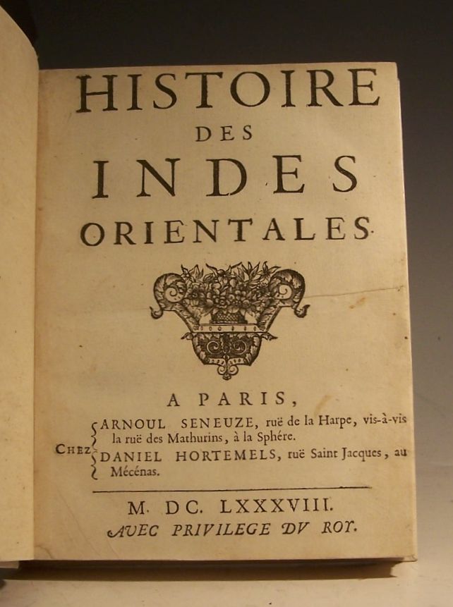 Histoire des Indes orientales. Paris: A. Seneuze & D. Hortemels, 1688, first edition, 4to, 3 larged engraved vignettes after Sevin, woodcut on title, Privilege leaf at end, modern vellum, spine gilt with morocco lettering pieces, cut a little close just trimming vignettes