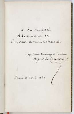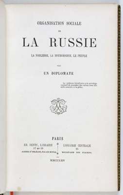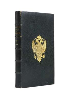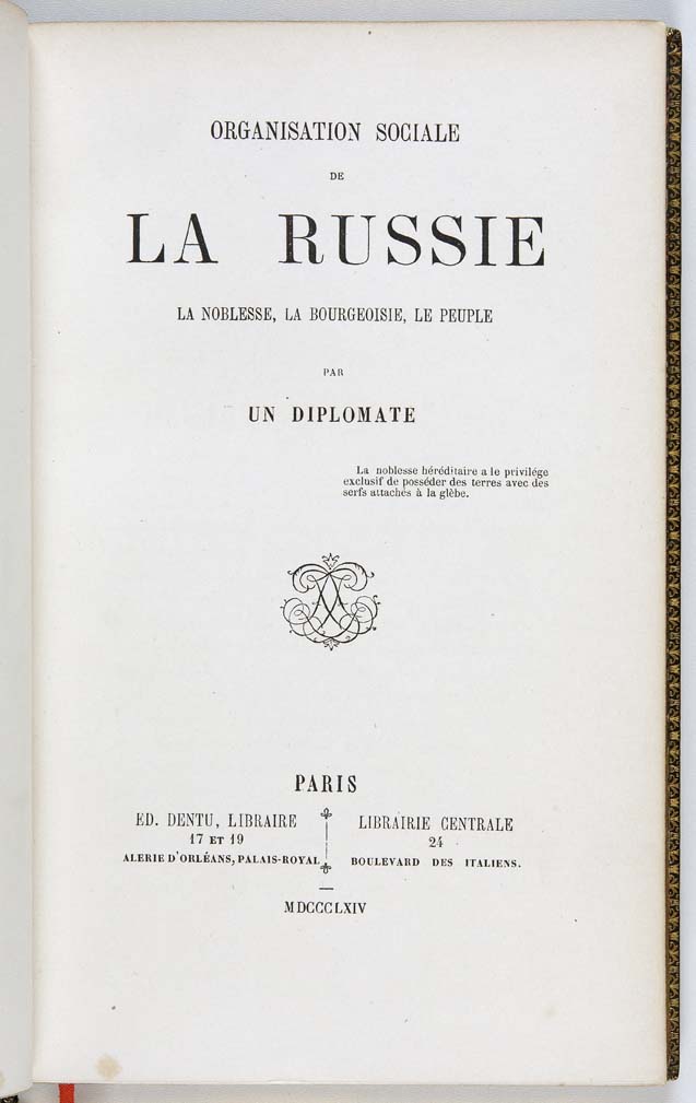 Organisation sociale de la Russie: la noblesse, la bourgeoisie, le peuple. Paris: Ed. Dentu, Librairie Centrale, 1864, 8vo, half-title, presentation copy, inscribed by the author to Alexander II, "à Sa Majesté Alexandre II... respectueux hommage de l'auteur... Paris 15 Avril 1864", contemporary crushed green morocco with Russian imperial arms gilt on upper cover, gilt crown on lower cover, green watered silk endpapers, gilt edges, extremities very slightly rubbed