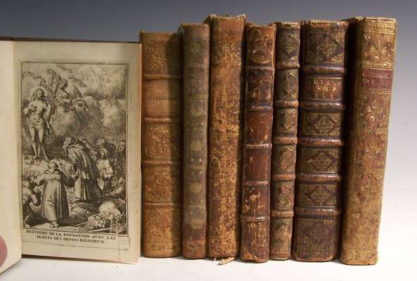 Histoire des ordres religieux. Amsterdam: A. Schoonebeek, 1695, second edition, 8vo, engraved frontispiece, title-vignette and 72 full-page engravings, nineteenth century panelled calf; Marcel, Guillaume Tablettes chronologiques contenant avec ordre, l'etat de l'eglise. Paris: Denys Thierry, 1682, 8vo, engraved frontispiece, folding "Explication" leaf before title, contemporary calf, lower corners from I2 -L4 torn away (not affecting text), head and tail of spine rubbed; Thiers, J.B. Traité de la clôture des religieuses. Paris: A. Dezallier, 1681, 12mo, contemporary calf, rubbed; Epicurus. La morale. Paris: Desaint & Saillant, 1757, edited by l'abbé Batteux, 8vo, 1 engraved plate (?only), contemporary calf, spine gilt, bookplate of James Dobie, slightly rubbed Scaliger, J. Scaligerana ou bons mots. Cologne, 1695, 12mo, edited by Le Fevre and M. de Colomies, engraved frontispiece, later calf, upper board loose; [Levêque de Pouilly, L.J.] Theorie des sentimens agreables. Paris: David le jeune, 1749, 12mo, engraved frontispiece and title vignette, contemporary calf, spine crudely repaired; Rochefoucault, F., duc de Réflexions ou sentences et maximes morales. Paris: J.G. Merigot, 1789, 8vo, contemporary calf, worn; [Coyer, G.F., l'abbé] Bagatelles morales. Londres, et se trouvent a Paris: Duchesne, 1755, 12mo, half-title, contemporary quarter calf with vellum corners, original label of Hookham's Original Circulating Library, Old Bond Street, pasted onto front endpaper, rubbed (8)